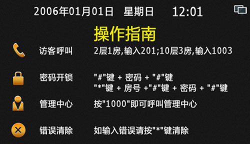 1) 門口機(jī)待機(jī)時(shí)的主界面,包括時(shí)間日期顯示,網(wǎng)絡(luò)是否在線,訪客呼叫、密碼開鎖、呼叫中心以及使用說明,如圖3.1.1: