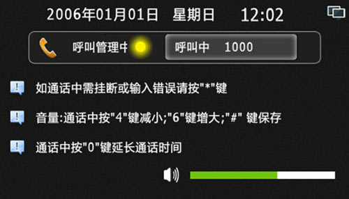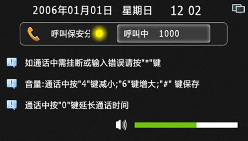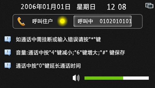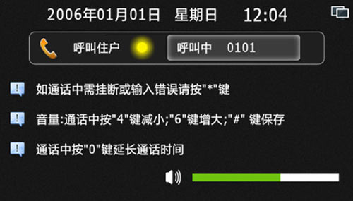 4) 輸入房號(hào)時(shí)錯(cuò)誤,可按“*”鍵清除,呼叫或通話過程中按“*”鍵可退出或結(jié)束通話,通話中按“4”或“6”可減小或增大音量,通話中按“0”鍵可延長(zhǎng)通話時(shí)間至60秒。
