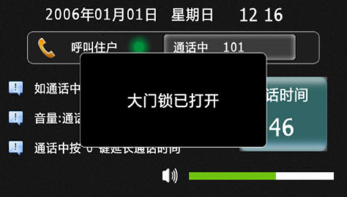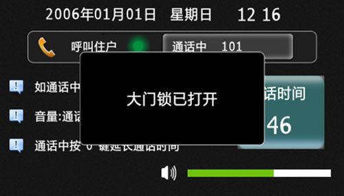 6) 呼叫業(yè)主或和業(yè)主通話時(shí),業(yè)主通過室內(nèi)機(jī)遠(yuǎn)程開鎖,門口機(jī)將顯示“大門鎖已打開”如下圖3.2.5: