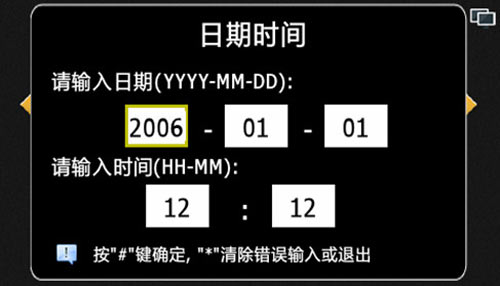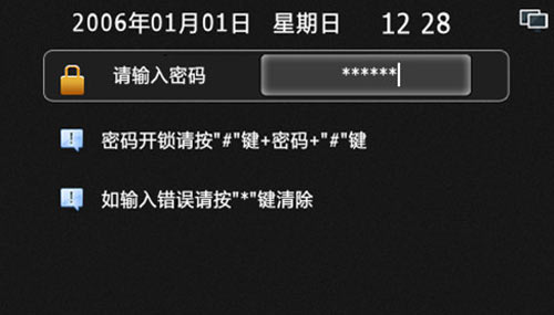 1) 設(shè)置機(jī)器的時(shí)間和日期,如果設(shè)置時(shí)間不合理,則會(huì)提示設(shè)置失敗。設(shè)備開機(jī)或運(yùn)行時(shí)會(huì)自動(dòng)同步物業(yè)中心軟件的時(shí)間。格式為安居樂X-XX-XX XX:XX,例如2006-1-1 12:00,“*”鍵可清除錯(cuò)誤輸入,“#”確定保存并退出,設(shè)置界面如圖4.10.1: