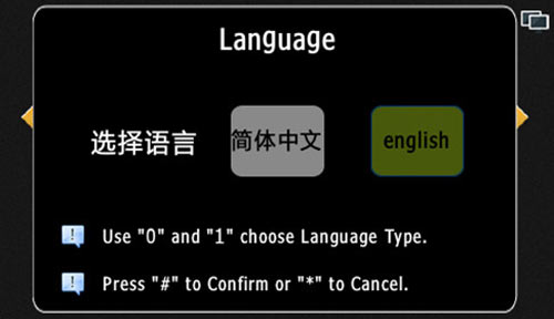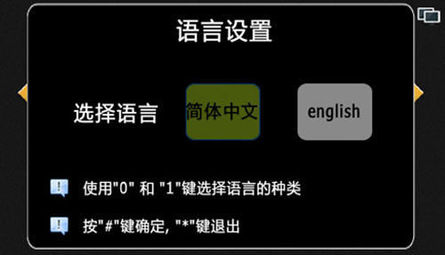 1) 設(shè)置機(jī)器的語言,默認(rèn)為中文顯示,按“0”選擇中文,按“1”選擇英文,“*”鍵退出,“#”保存并退出,中文和英文顯示如圖4.9.1和4.9.2:
