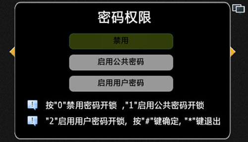 1) 設(shè)備出廠默認(rèn)開鎖為禁用,按照界面提示,“0”選擇禁用,系統(tǒng)將無法使用開鎖密碼來開啟門鎖;“1”啟用公共密碼開鎖,用戶可通過公共開鎖密碼開啟門鎖;“2”啟用用戶密碼開鎖,用戶可通話用戶開鎖密碼開啟門鎖。“*”鍵退出,“#”鍵確認(rèn),設(shè)置界面如圖4.5.1: