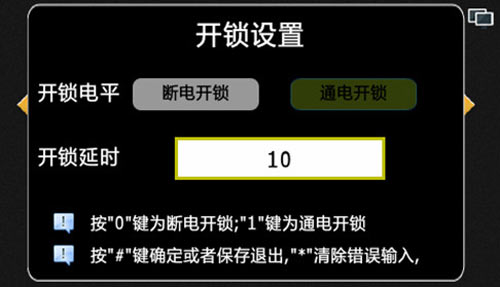 1) 設(shè)置電控鎖的開鎖方式以及開鎖延時(shí),默認(rèn)為通電開鎖,延時(shí)為10秒,。按“0”選擇斷電開鎖,按“1”選擇通電開鎖,按“#”進(jìn)入開鎖延時(shí)選項(xiàng),輸入延時(shí)后按“#”鍵保存(延時(shí)范圍為1-150秒),按“*”鍵可清除錯(cuò)誤輸入或退出開鎖設(shè)置界面,如圖4.7.1: