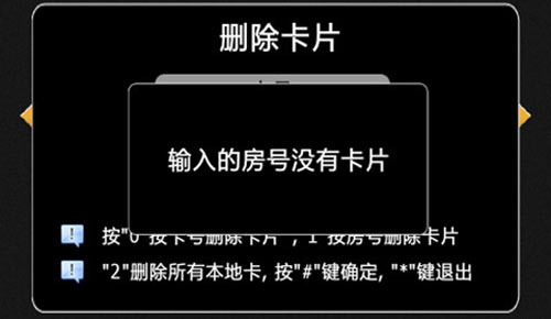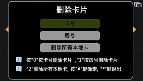 4) 按“1”選擇刪除卡片,進(jìn)入下一級(jí)菜單,如圖4.12.4,按“0”按照卡號(hào)來刪除卡片,按“1”按照房號(hào)來刪除卡片,按“2”刪除所有本地發(fā)出的卡片。