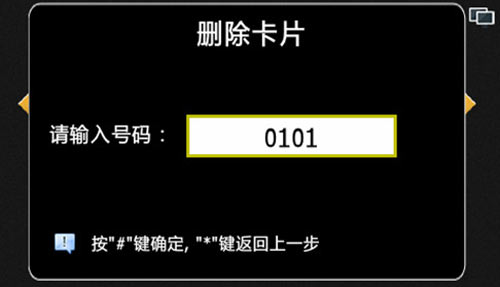 按“1”+“#”選擇房號(hào)后,輸入需要?jiǎng)h除所有卡對(duì)應(yīng)的房號(hào),如果在單元機(jī)上需輸入4位房號(hào),例如0101,如圖4.12.6,如果在圍墻機(jī)上需輸入10位房號(hào),例如0102010101。若該房號(hào)存在IC卡,則刪除該房號(hào)的所有住戶IC卡;若輸入的房號(hào)沒有卡片,則提示輸入的房號(hào)沒有卡片,如圖4.12.7: