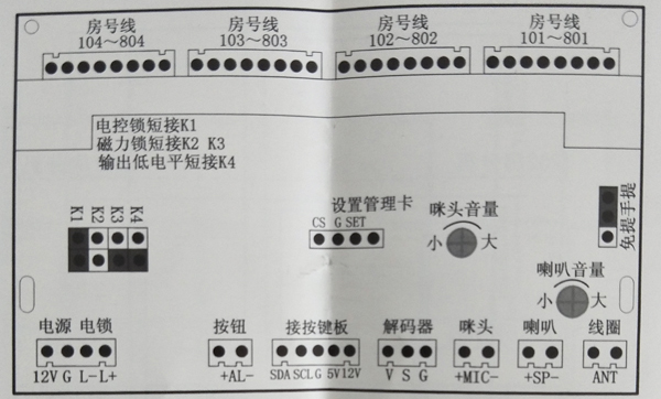 安裝施工調(diào)試時,安裝工作人只可以根據(jù)現(xiàn)場環(huán)境的需要進行一些調(diào)整, 比如:通話聲音過大或過小,可以稍微調(diào)整“咪頭音量”的電位器(如圖5所示),一般不用調(diào)整。 設備受施工場所、環(huán)境、線材質(zhì)量等因素的影響,主機或分機可能會出現(xiàn)嘯叫吉。如果出現(xiàn)此類情況,安裝工作人員可以通過調(diào)整“咪頭音量” 和“喇叭音量” 的電位器(如圖5所示)。