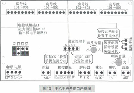 安裝施工調(diào)試時,安裝工作人員可以根據(jù)現(xiàn)場環(huán)境的需要進行一些調(diào)整,比如,通話聲音過大或過小,可以稍微調(diào)整“咪頭音量”的電位器(如圖10所示),一般不用調(diào)整。設備受施工場所、環(huán)境、線材質(zhì)量等因素的影響,主機或分機可能會出現(xiàn)嘯叫聲。如果出現(xiàn)此類情況,安裝工作人可以通過調(diào)整“咪頭音量”和“喇叭音量”的電位器(如圖10所示)。電位器的調(diào)整方法:逆時針旋轉(zhuǎn)半圈至一圈慢慢調(diào)小,直至嘯叫聲消失,主機和分機都能聽到最大最清晰最洪亮的對話即調(diào)試完畢。